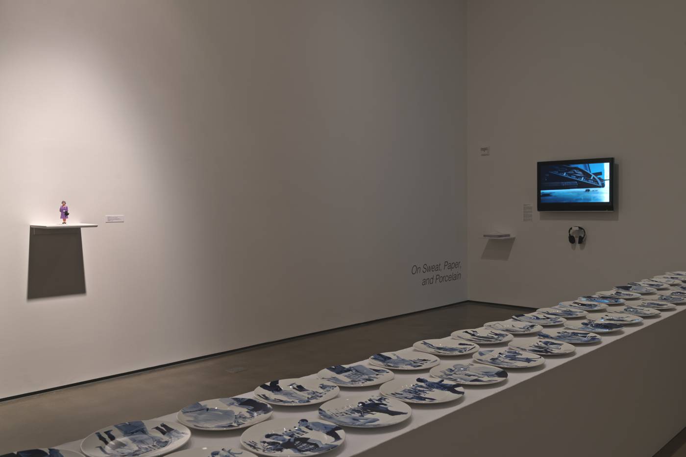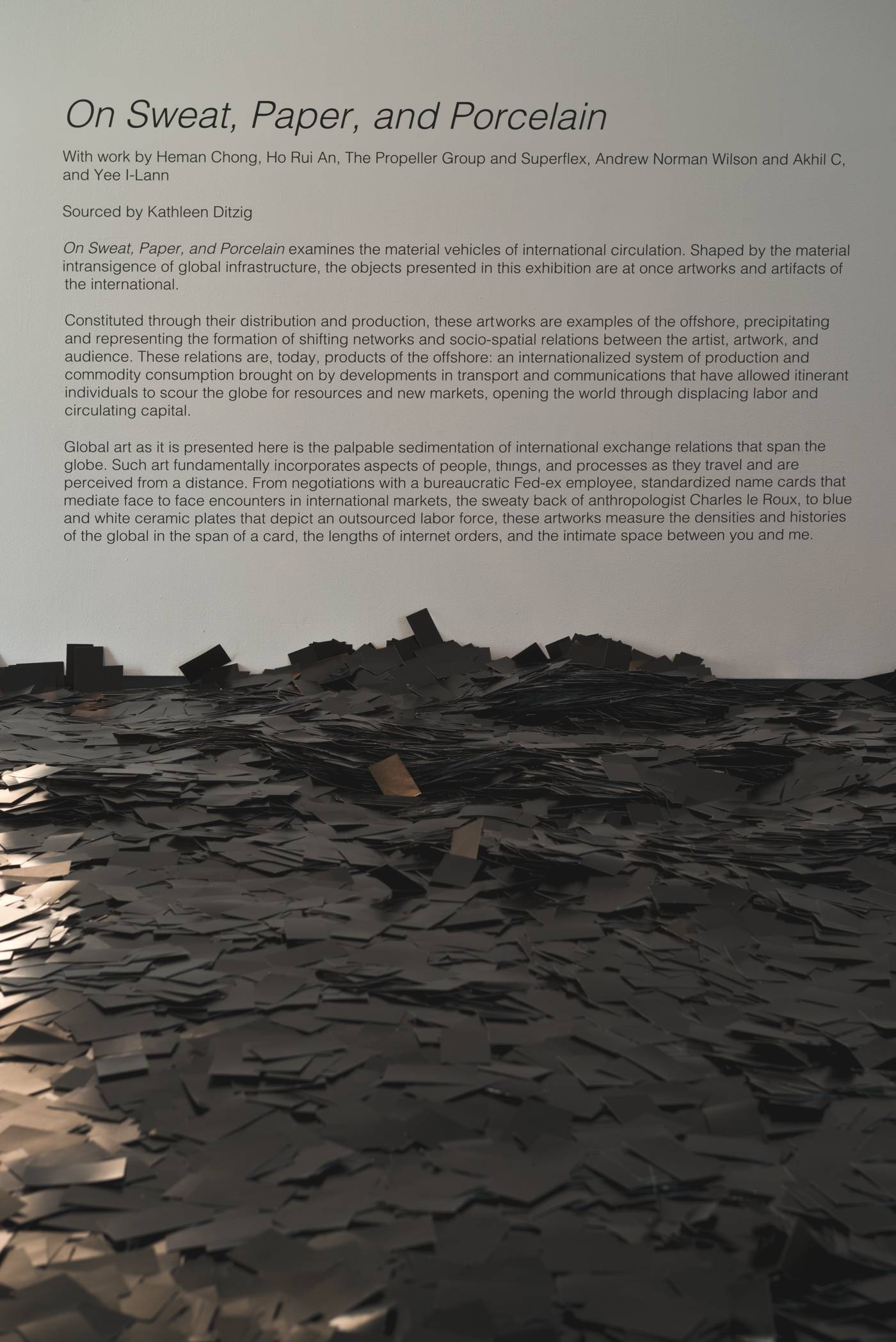On Sweat, Paper, and Porcelain examines the material vehicles of international circulation. Shaped by the material intransigence of global infrastructure, the objects presented in the exhibition are at once artworks and artifacts of the international.