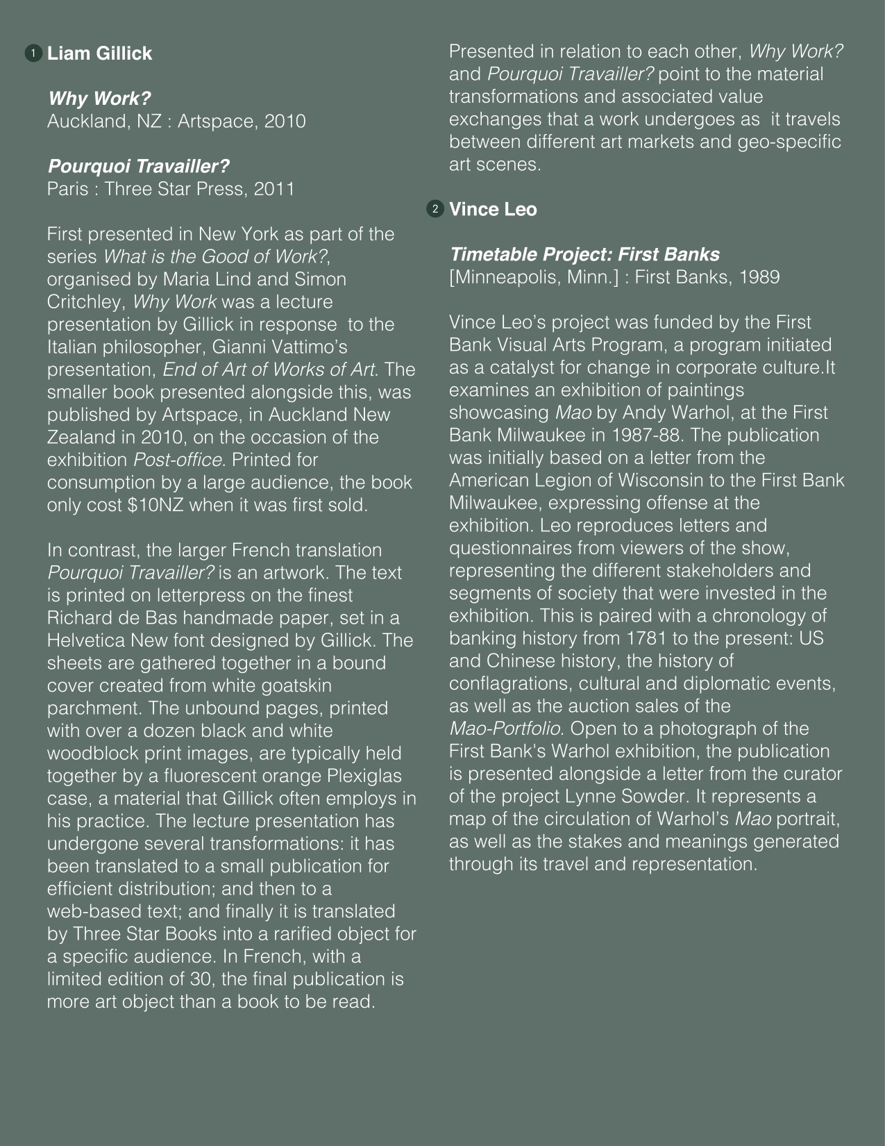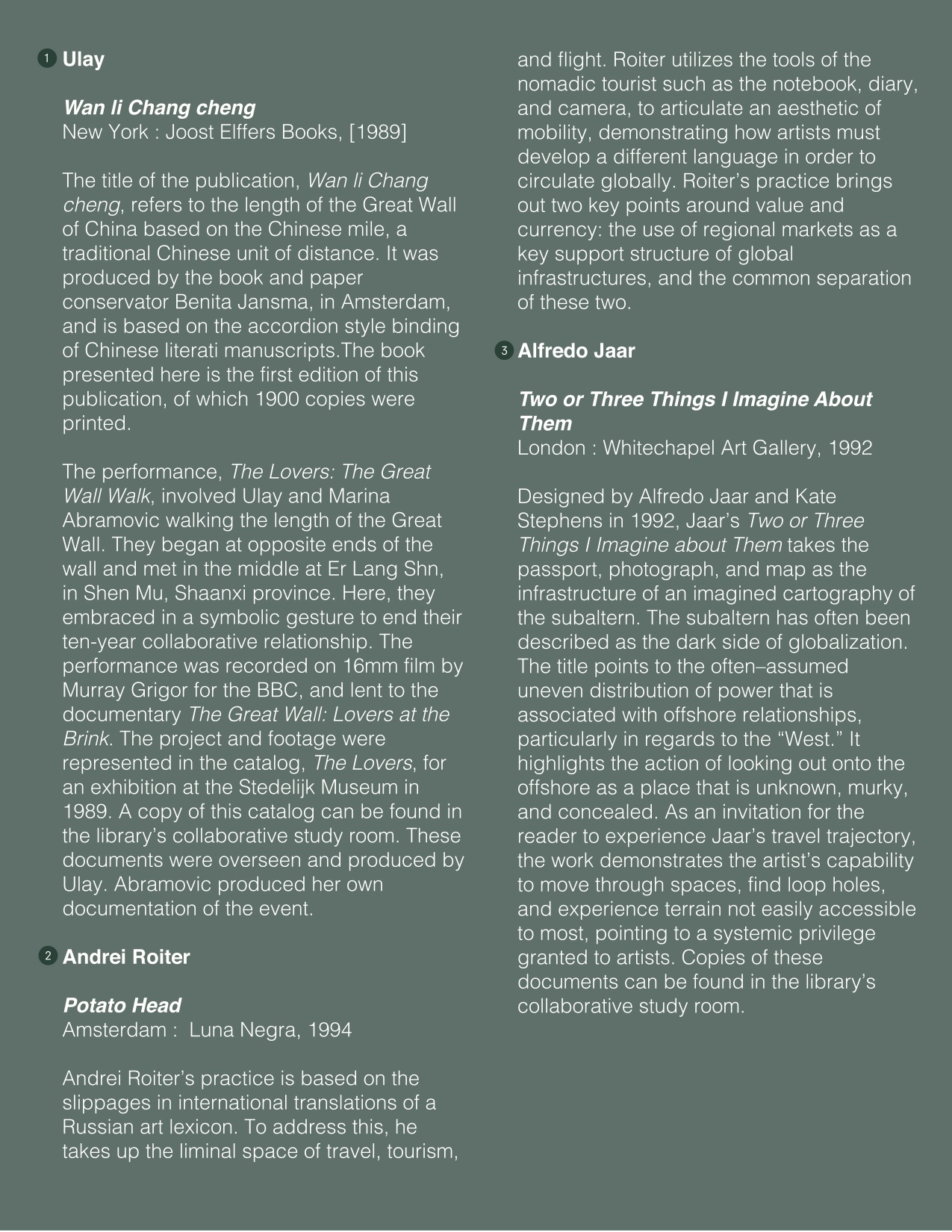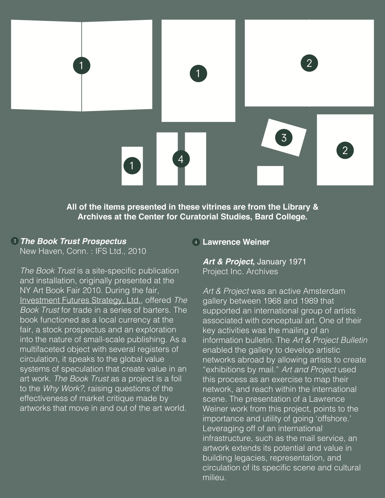 “Roundtripping” is a financial strategy in which capital goes from a central source to a foreign jurisdiction and then returns to the originating country. The strategy is used to distort statistics on foreign direct investment by generating overly optimistic assessments of an economy’s vitality. The items selected in Roundtripping have all undertaken similar complete circuits, but in the art world. The ‘original’ work - for example, a lecture by Liam Gillick, or a performance by Ulay and Marina Abramović - is in each case transformed by the process of travel, effectively aping the global influence of the work. Roundtripping presents works that crystallise the process of generating cultural capital through travel.